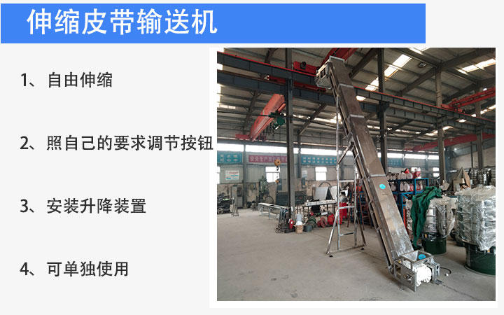 伸縮皮帶輸送機是在普通皮帶輸送機上增加了伸縮機構,可以在長度方向上自由伸縮,隨時控制輸送機的長度,可雙向輸送物料,也可與其他設備配合使用,以實現物料出入庫或車輛裝卸的自動化生產,縮短了人工往返搬運物料的距離,可以縮短貨物裝卸貨時間,降低勞動強度,降低裝卸成本,提高工作效率。